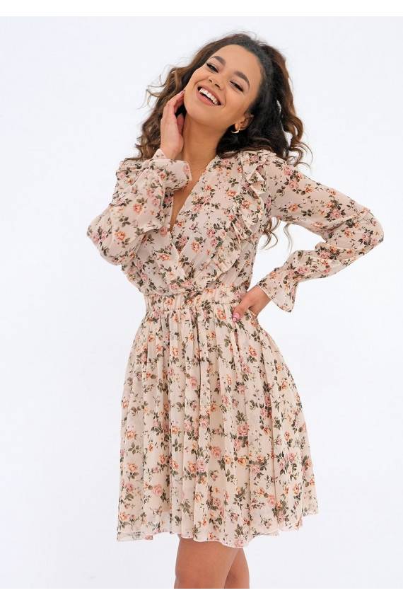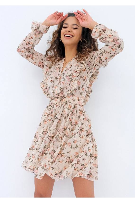 Rosalia - beige chiffon mini dress with a roses print