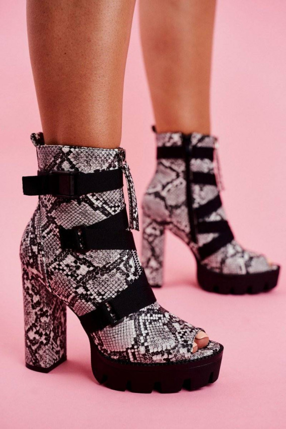 Exclusive women's open toe boots! Made of eco leather with interwoven stripes on the upper. Zippered. Set on a high post and platform that will raise and display your figure. The insole is made of ecological leather. Get yourself a little extraordinary look!