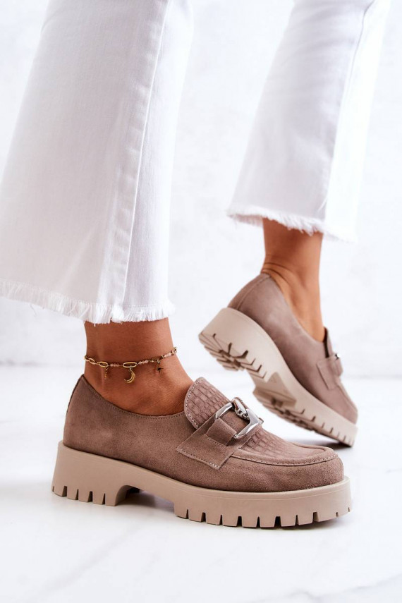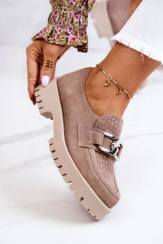 Slip-on shoes made of natural suede with a rounded toe. They are mounted on a massive platform and a flat, stable heel. l with a high tread on the sole. Decorative chain on top. There is an elastic band under the tongue, thanks to which the shoe will be more fitted to the foot. The shoes have a stiffened heel. Fashionable, comfortable, made with attention to detail - in a word: perfect! A soft, natural leather insole will take care of your comfort. When choosing a size, please use the size chart.
