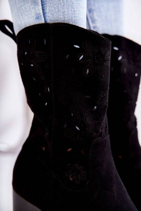Boots with a cowboy style are mounted on a heel in the form of a massive post. The upper ankle in a delicate, openwork pattern with a floral motif. Classic, zippered model with a characteristic pointed toe. Made of eco suede. Uninsulated, they will be perfect for transitional seasons. They fit many styles, for example trousers or boho-style skirts. When choosing a size, please use the size chart.