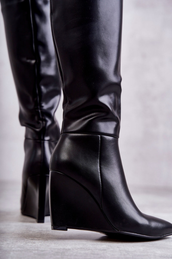 Fashionable boots mounted on a heel in the form of a wedge. They have a pointed toe that optically slender the leg. The upper is made of eco leather. Cut above the knee with a zipper along the entire length of the upper. In addition, the boots have a stiffened heel. The perfect model for dresses or skirts. This model is a HIT this season! It should not be missing in your wardrobe! When choosing a size, please use the size chart.