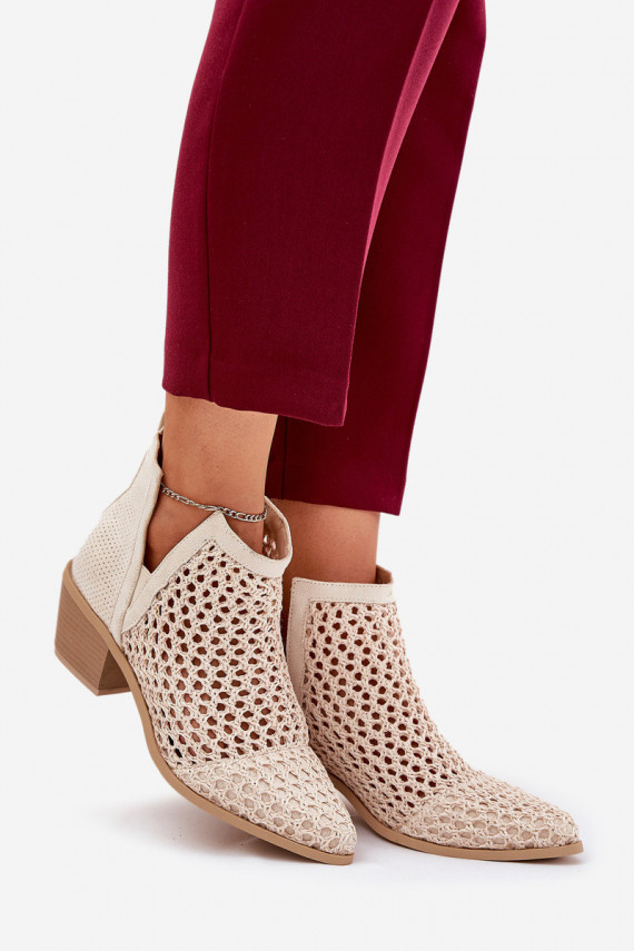 Low heel ankle boots that combine comfort with a fashionable look. The pointed toes give them a sensual character, while the subtle cutouts on the sides of the shaft add lightness and a modern style to the shoes. The front of the shoe is adorned with an openwork pattern with weaving that highlights their unique appearance. An additional advantage is the soft insole, providing comfort while walking throughout the day. An ideal choice for spring and summer days. When choosing a size, please refer to the size chart.